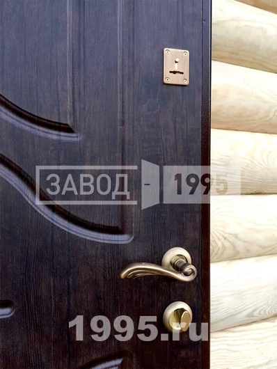 Конструкция входных дверей включает в себя профиль, лист металла толщиной 2 мм, наполнитель, декоративную панель и резиновый уплотнитель. С двух сторон она отделана микродревесными панелями. Изделие имеет оригинальный фрезерованный рисунок, который позволит ему хорошо вписаться в офисный интерьер. Данная дверь за счет отделки панелями под дерево не будет выглядеть в проеме тяжеловесно.