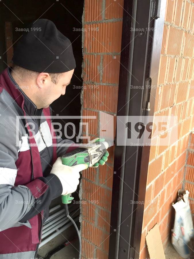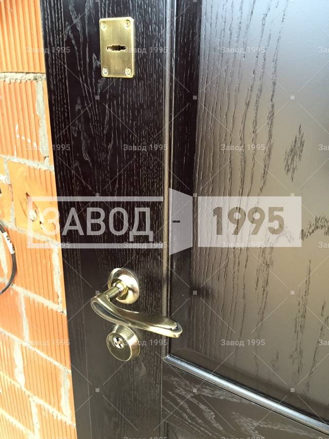 Монтаж металлической двери с отделкой массивом дуба в коттеджном поселке Европейская Долина. Утепленное полотно декорировано вставкой в виде стеклопакета.